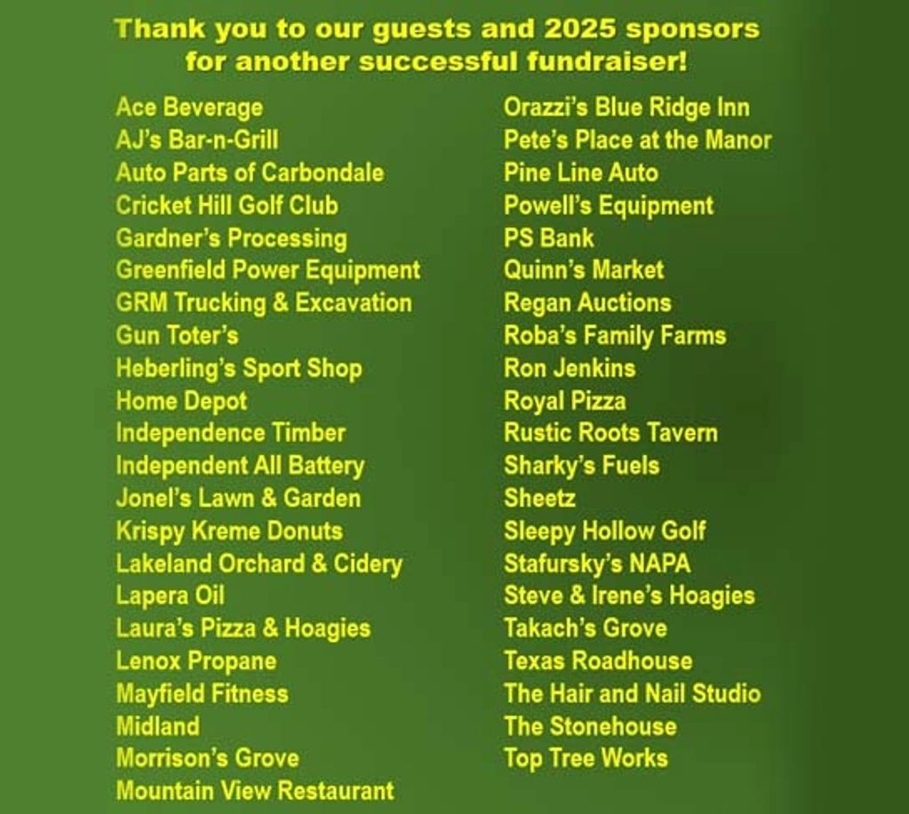 Sponsors: Gardners Wild Game Processing, Greenfield Power Equipment, Jonals Lawn & Garden, JRS Landscaping & Construction, Lapera Oil, Leo's Garage, NAPA Auto Parts, Orazzi's Blue Ridge Inn, Pine Line Auto, Stafursky NAPA Auto Parts